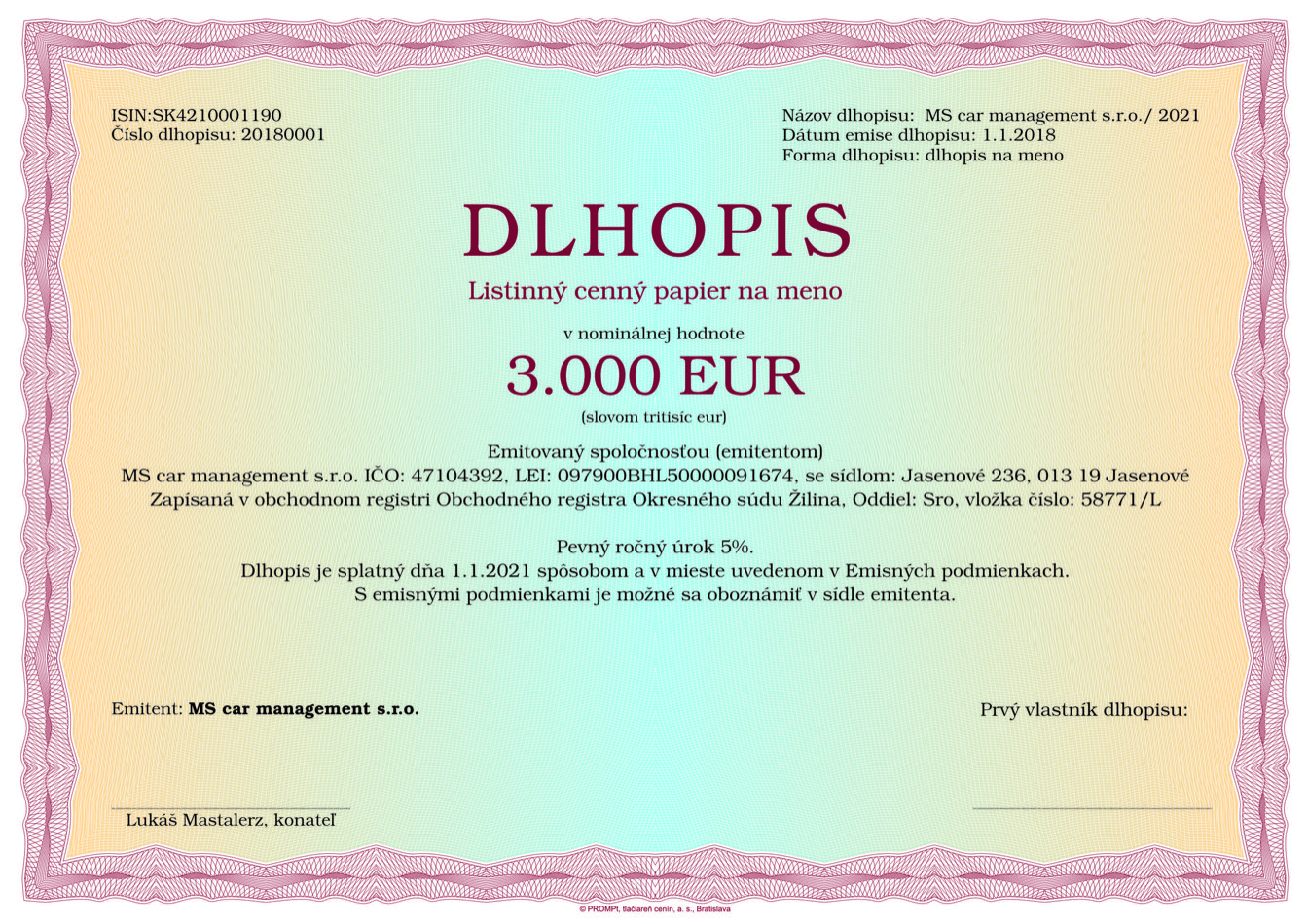 | NÁZOV EMISIE | Dlhopis MS car management s.r.o./2021 |